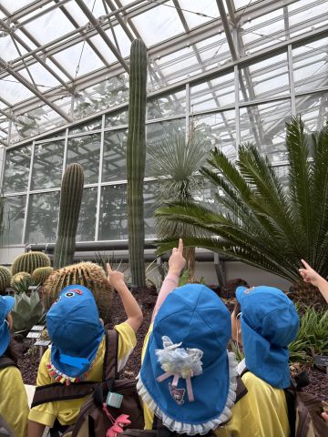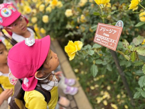 公園内にあるバラや花を見つけると「きれい!」と駆け寄り香りをかいだり、サボテンを見つけると「大きい~」目を輝かせていました。