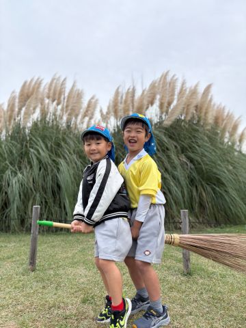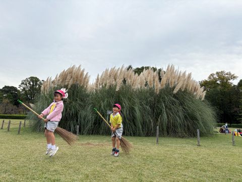 また、広い芝生では大きなパンパスグラスの前でホウキにまたがり魔法使いごっこを楽しみました♪