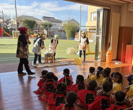 皆が力いっぱいについたお餅は幼稚園の鏡餅になるよ! どこにあるか探してみてね♪