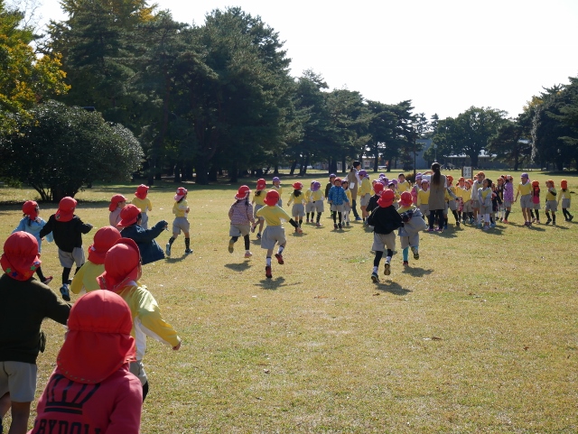 年長組、秋晴れの中、野川公園に行って来ました。逆立ち歩きの練習やライオンキングの練習をした後、近くの遊具で遊びました。体をいっぱい動かしたね!!