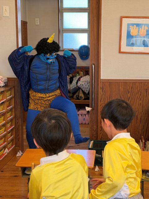 2月3日節分の日に幼稚園に赤鬼と青鬼がやってきました。